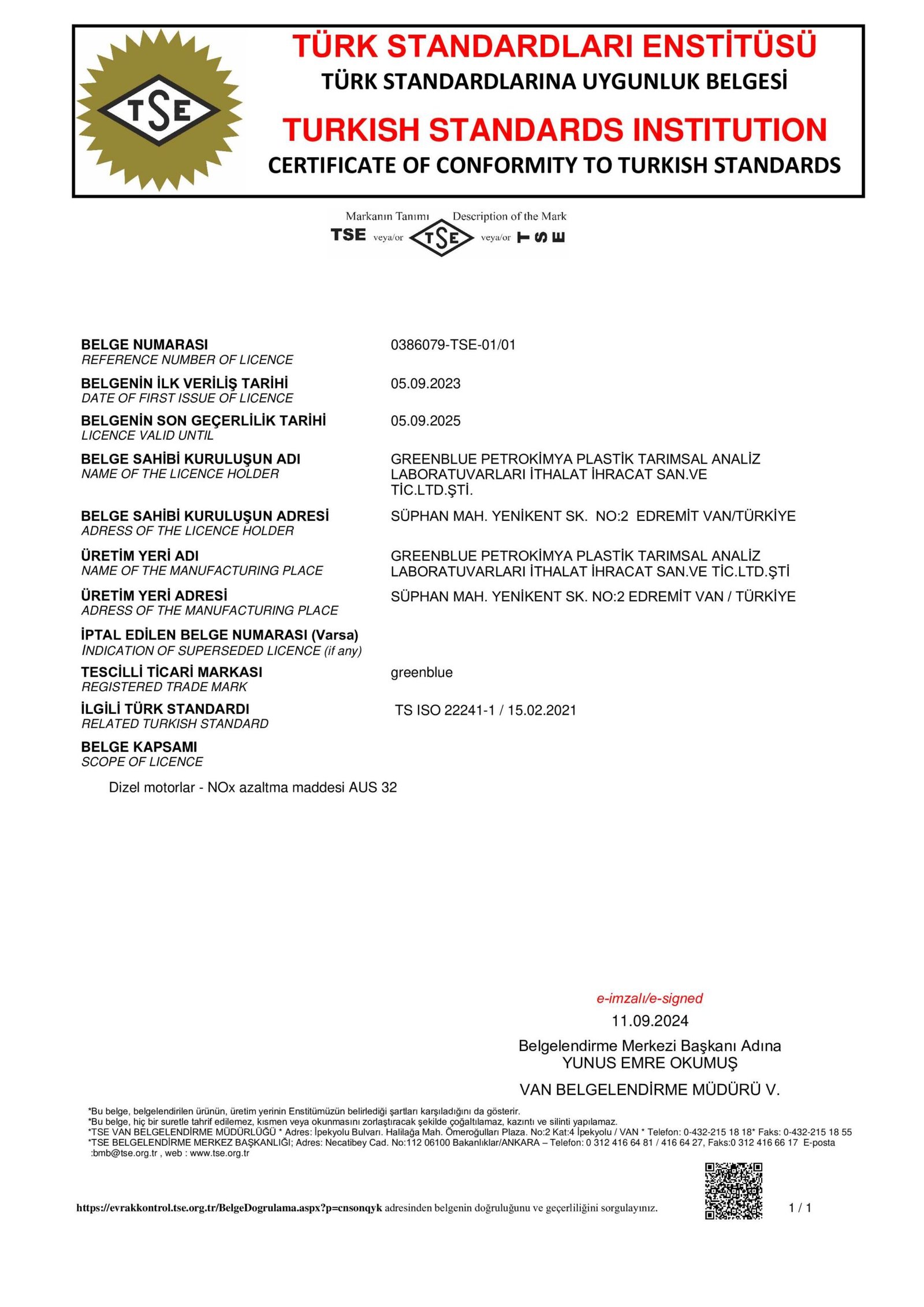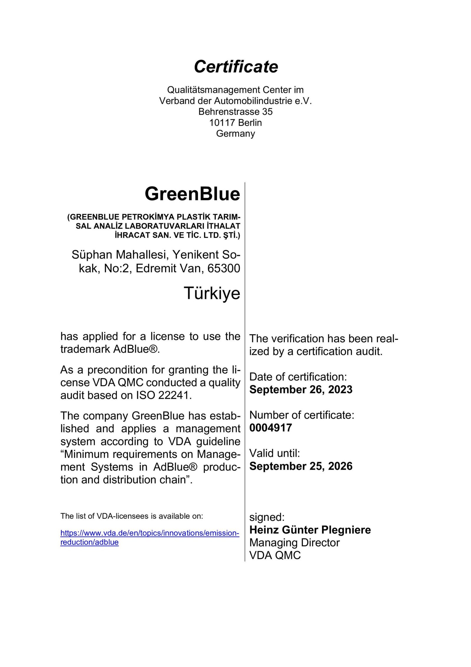 Our company conducts all ISO 22241-1-2-3-4 tests using our own dedicated chemists and laboratory personnel. To ensure consistent product quality, we continuously cross-reference our internal test results with accredited external laboratories.Every product shipped to our customers is accompanied by a detailed Quality Report. Furthermore, our packaged products are marked with LOT numbering and QR codes for full traceability to the end user.In the event of a product complaint, reference samples taken during the filling process are carefully retained for a period of 18 months